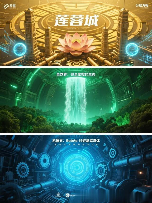 - 底层机器界:机器人的制造中心与生活场,RobAo-I9硅基克隆机器人在此源源不断产出物质资源。它们是“高度智能却无智慧”的造物,象征着人类对工具的绝对掌控,却也暗藏“复制与分化”的零道智元危机——当机器人渴望获取人类独有的智慧体,内部威胁便如暗流涌动。